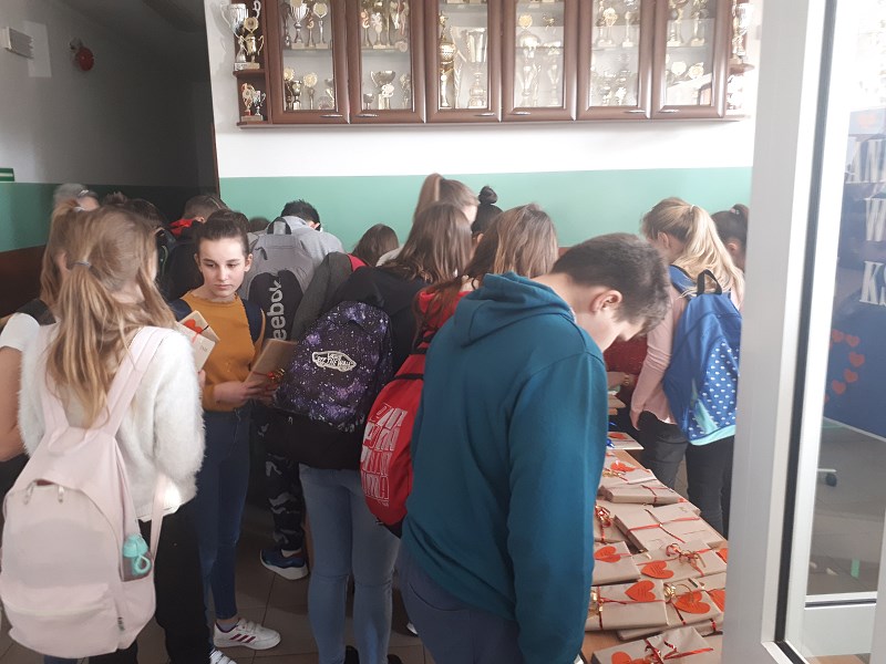 14 lutego obchodziliśmy Walentynki.  Z tej okazji  Szkolne Koło Wolontariatu przygotowało dla  czytelników Biblioteki szkolnej możliwość wypożyczenia książek – niespodzianek. Nie można było zobaczyć tytułu czy autora, ponieważ książki zostały specjalnie zapakowane w szary papier i miały dołączone tylko krótkie cytaty.