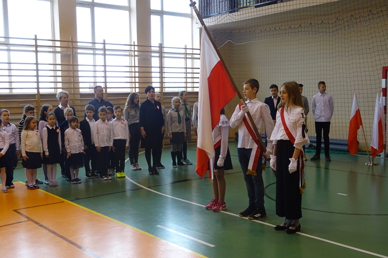 wszyscy odświętnie ubrani wspólnie odśpiewali hymn "Mazurek Dąbrowskiego".