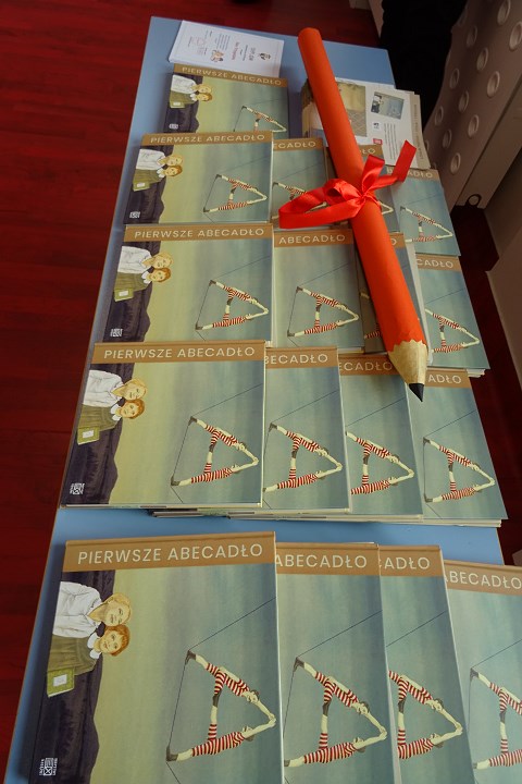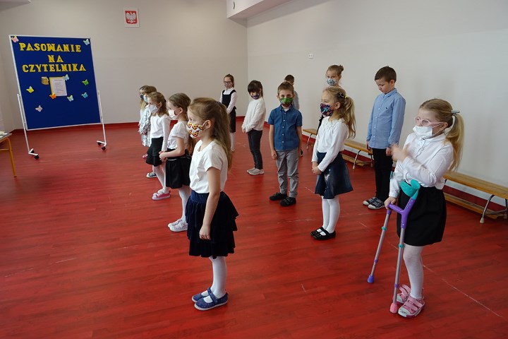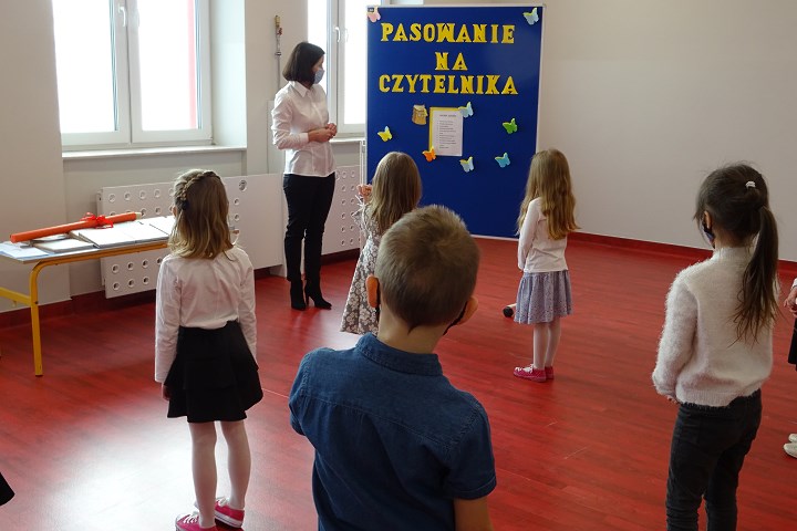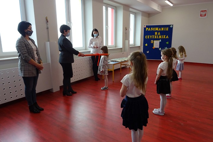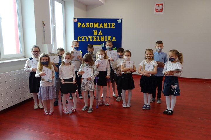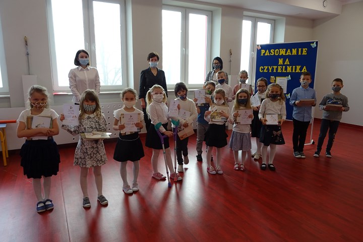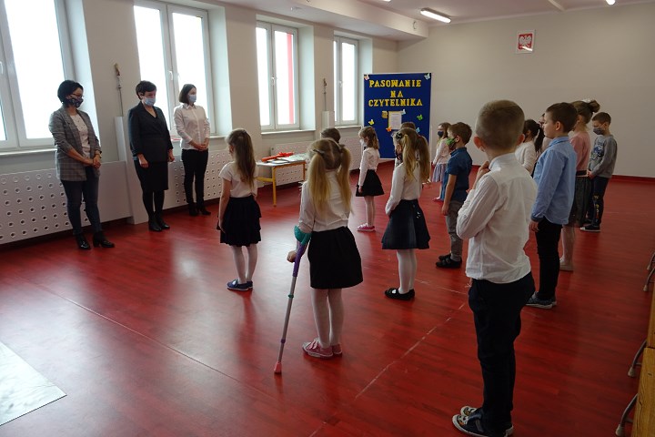Następnie uczniowie złożyli uroczyste przyrzeczenie,po którym dyrektor szkoły pani Nina Budziosz pasowała ich na czytelników biblioteki. Pierwszoklasiści oprócz pamiątkowych dyplomów otrzymali Wyprawki Czytelnicze przygotowane przez Instytut Książki w ramach kampanii „Mała książka – wielki człowiek”, której strategicznym celem jest rozwój czytelnictwa wśród dzieci w różnych grupach wiekowych. W skład prezentowego pakietu weszły: książka „Pierwsze abecadło”, broszura informacyjna dla rodziców i opiekunów „Książką połączeni, czyli uczymy się czytać razem” oraz kreatywny alfabet.