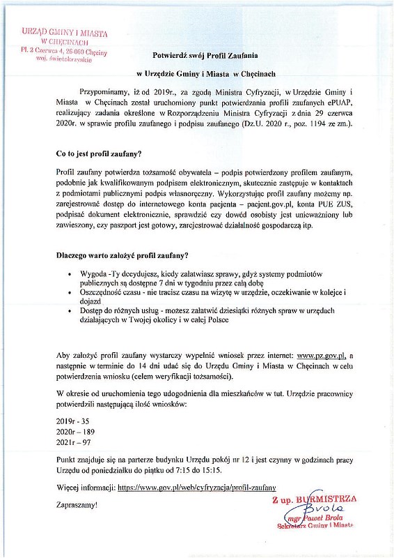 Potwierdź swój Profil Zaufania w Urzędzie Gminy i Miasta w Chęcinach.