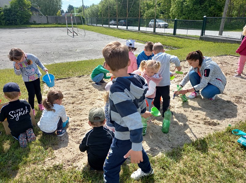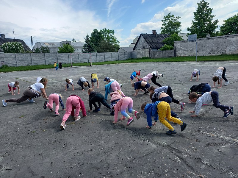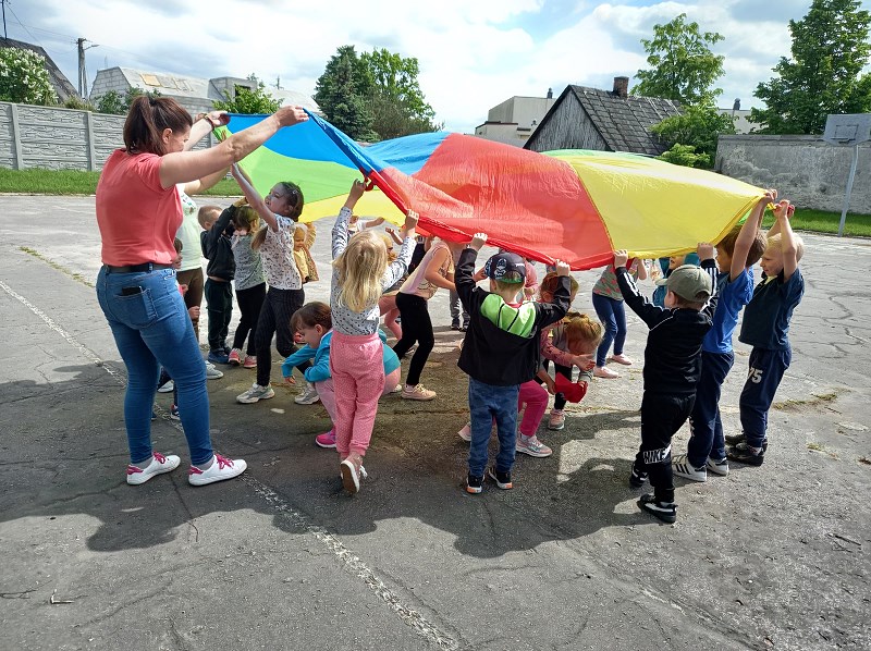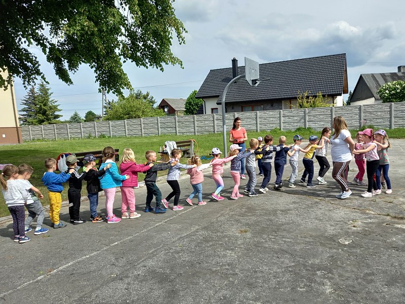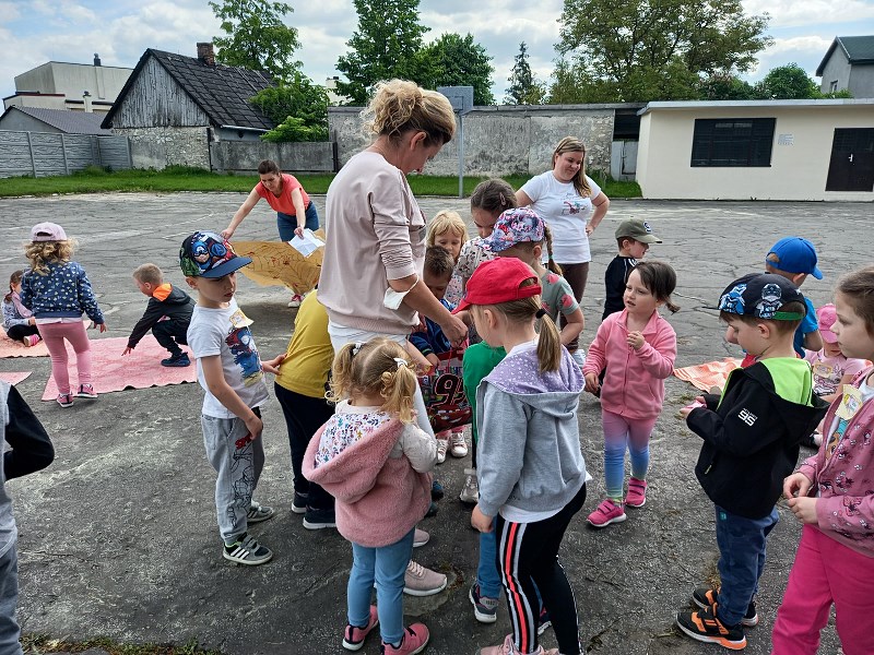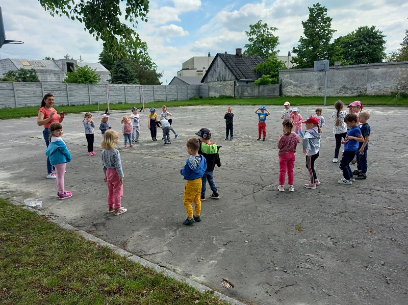 Tego dnia staraliśmy się, jak to tylko możliwe, umilić im ten czas przygotowując wiele atrakcji na świeżym powietrzu tj. zabawy muzyczno ruchowe, malowanie i odbijanie rączek na planszy z pajęczyną, zabawy w piaskownicy, z chustą animacyjną, gra w kręgle. Nie zabrakło również baniek mydlanych, baloników oraz innych fajnych zabaw, które sprawiły wszystkim ogromną radość.