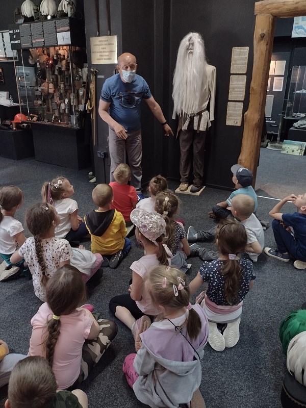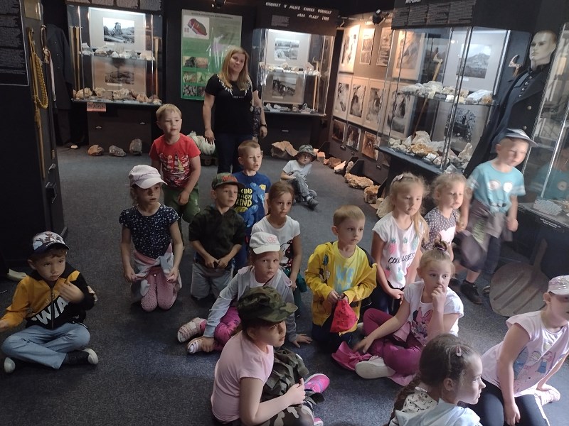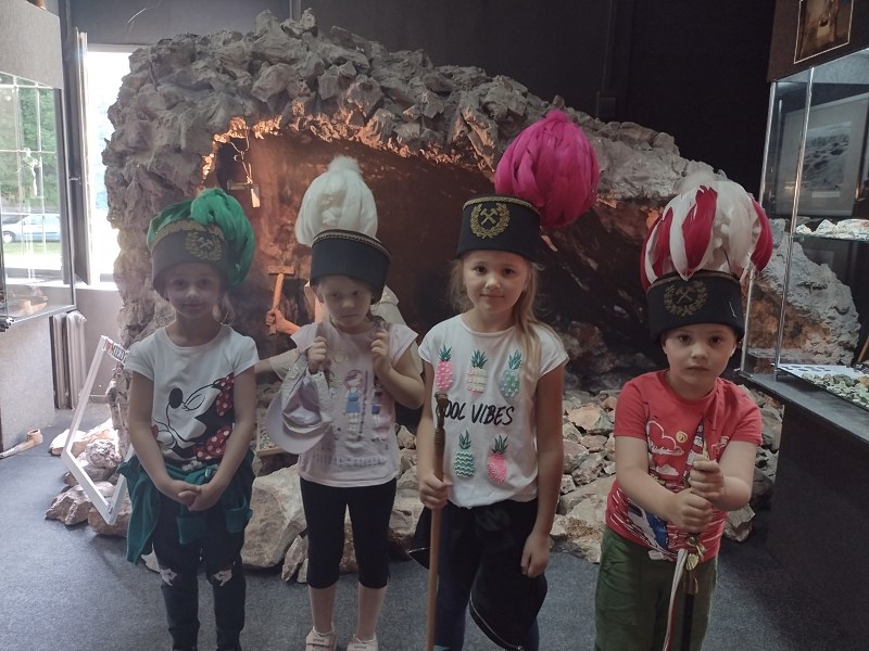 Na miejscu przywitał nas przewodnik, który oprowadził nas po Muzeum. W izbach muzealnych oglądaliśmy skamieniałości i minerały, makietę średniowiecznego górnika, narzędzia górnicze. Dzieci mogły przymierzyć czapki górnicze, wziąć do ręki lampę i szablę górniczą.