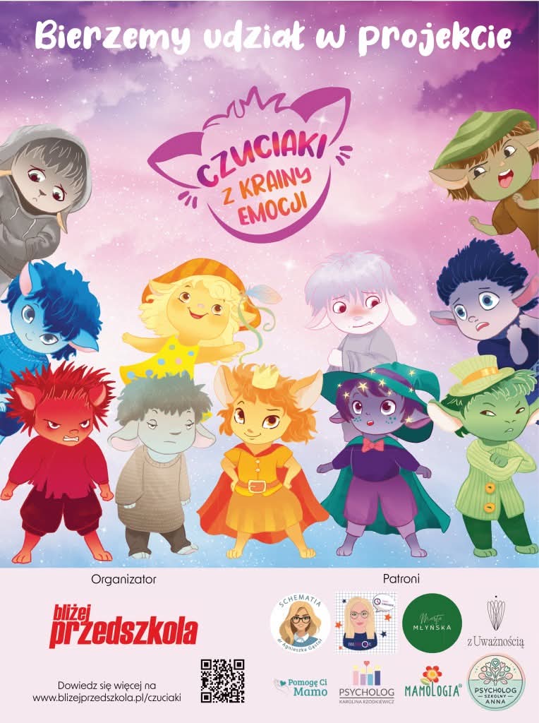 W roku szkolnym 2025/2026 oddział przedszkolny grupa A przystępuje do nowego projektu edukacyjnego „Czuciaki z Krainy Emocji”, realizowanego pod patronatem Bliżej Przedszkola. Celem tego programu jest wspieranie dzieci w rozwoju ich inteligencji emocjonalnej – tak ważnej w dzisiejszym świecie.