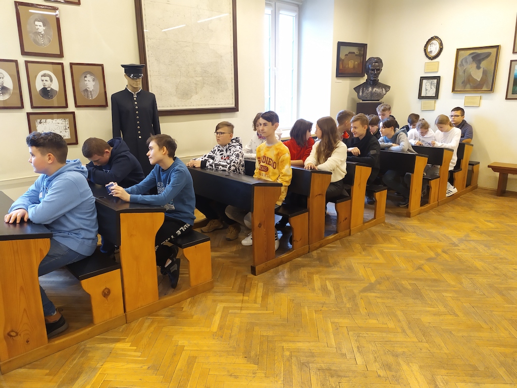 Jednym z punktów wycieczki była wizyta w Muzeum Lat Szkolnych Stefana Żeromskiego. Pani przewodnik opowiedziała uczniom historię budynku i szkoły, domu i dziejów rodziny Żeromskich oraz dokładnie przedstawiła sylwetkę pisarza. Następnie, idąc alejkami Parku miejskiego im. Stanisława Staszica, siódmoklasiści dotarli do pomnika Stefana Żeromskiego, rzeźby „Przysięga miłości” umiejscowionej tuż przy uchodzącym do stawu źródle Biruty.