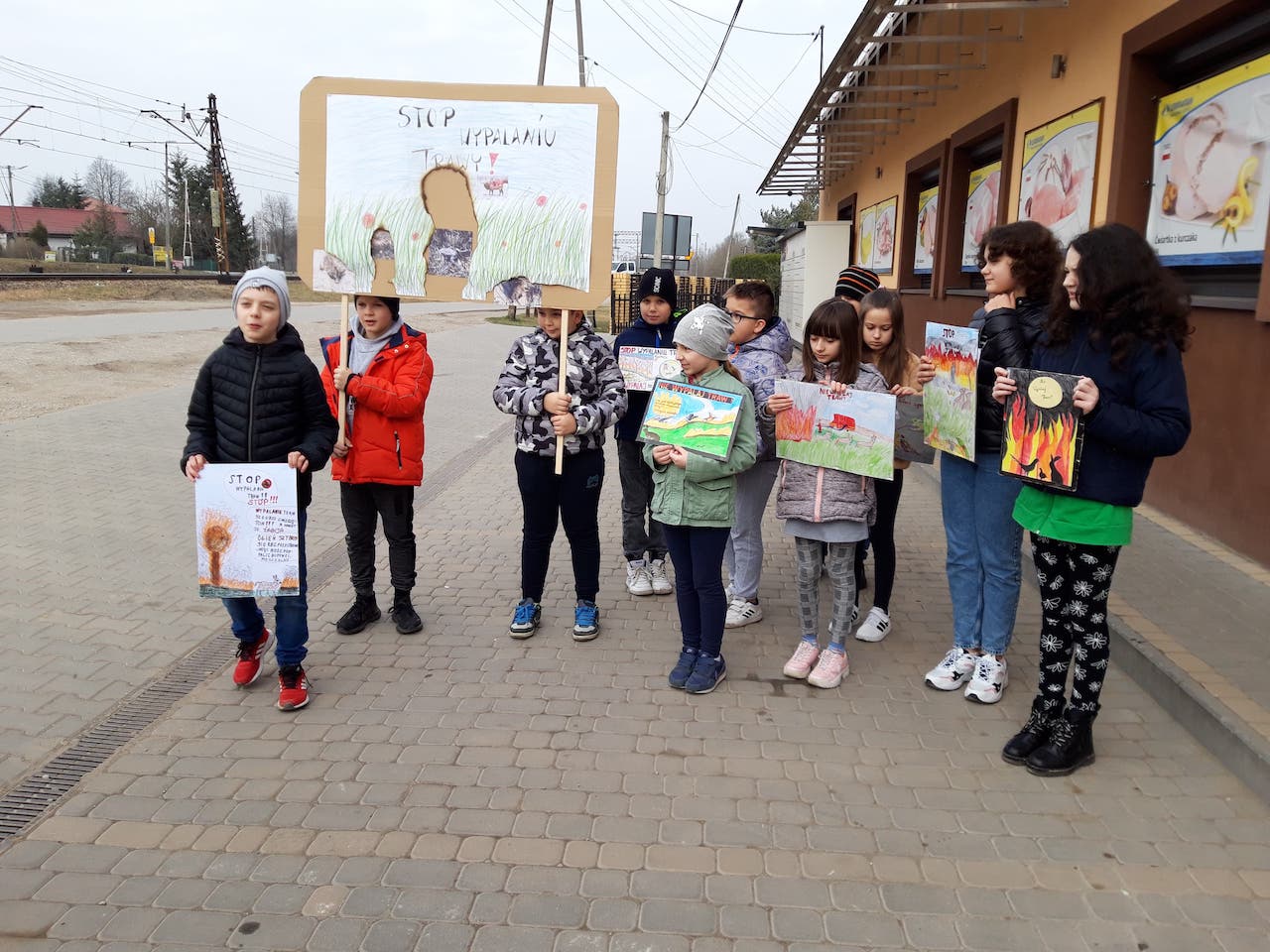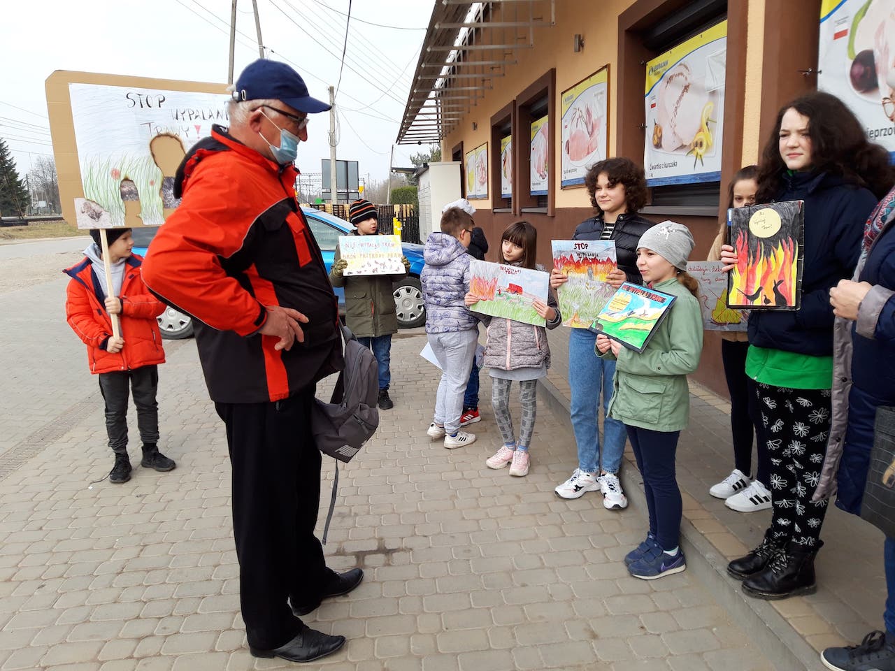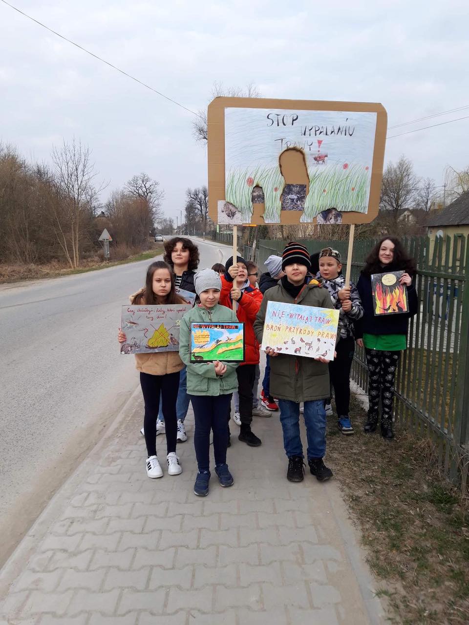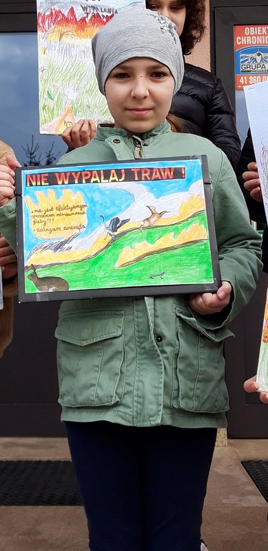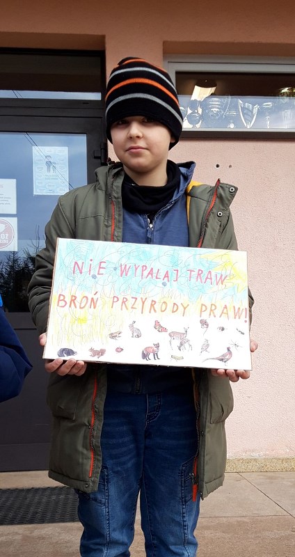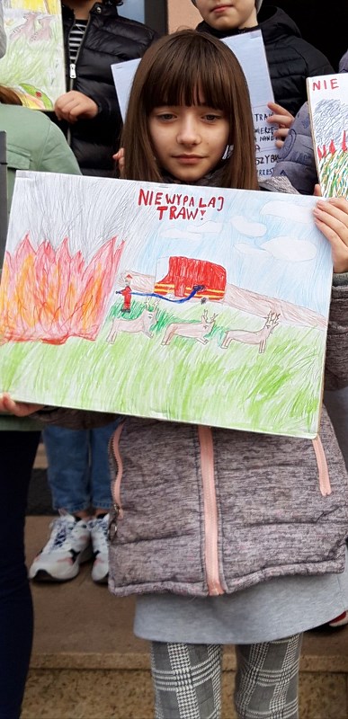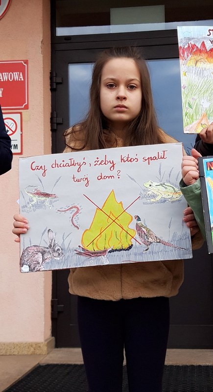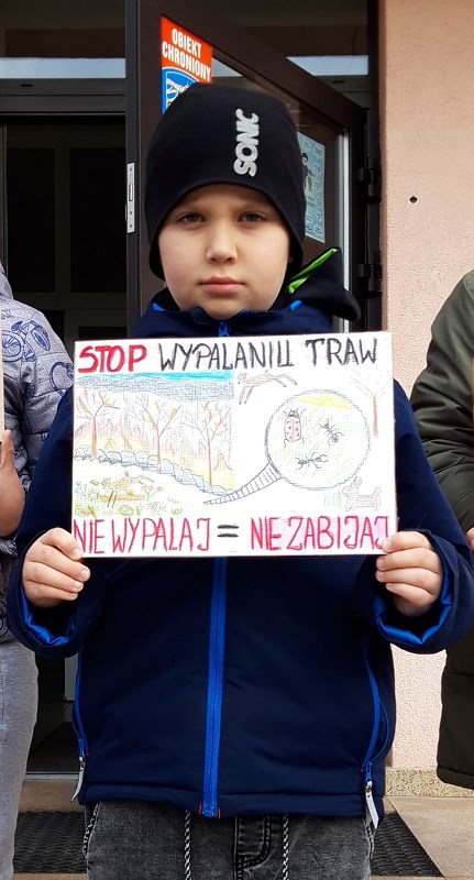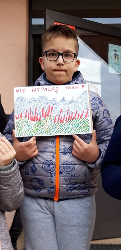 Tematem akcji była szkodliwość wypalania traw. Uczniowie kl. IV edukowali mieszkańców i społeczność szkolną nie tylko poprzez samodzielnie przygotowane plakaty dotyczące powyższej tematyki, ale również dzielili się wiedzą jaką zdobyli na zajęciach koła ekologicznego. Poruszyli takie zagadnienia jak: uśmiercanie zwierząt kręgowych, ptaków owadów, dużych zwierząt leśnych jak sarny, jelenie czy dziki i narażanie ich na ciężkie rany wywołane poparzeniem oraz niszczenie ich naturalnych siedlisk. Nasi wychowankowie przypomnieli o zagrożeniu jakie niesie pożar dla okolicznych domostw, lasów, czy też dla bezpieczeństwa poruszających się po drogach pojazdów i ich użytkowników. Podzielili się również aspektami prawnymi i konsekwencjami prawno- karnymi jakie mogą być wyciągnięte w stosunku do osób, które świadomie dopuściły się takiego procederu jakim jest wypalanie traw. Uświadamiali, iż wypalanie traw przyczynia się do obniżenia rolniczej i ekologicznej wartości gruntów. Niemożliwe staje się właściwe napowietrzenie gleb, stąd zachodzą w niej niekorzystne dla wszelkich procesów biochemicznych zjawiska. Uczniowie zwrócili też uwagę na koszty i duże zużycie wody podczas gaszenia pożaru. Przypomnieli o obowiązku zgłaszania pożaru właściwym służbom podając jednocześnie numery telefonów 998 i 112.