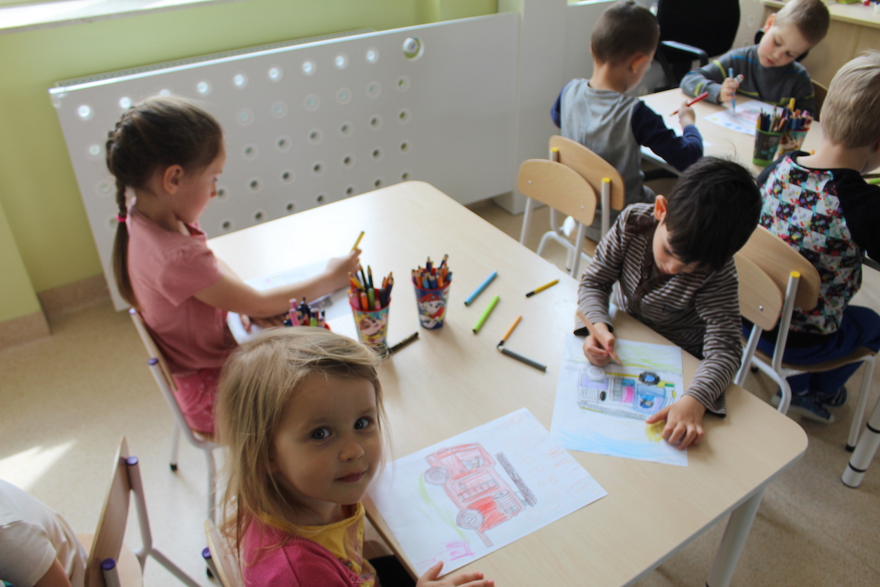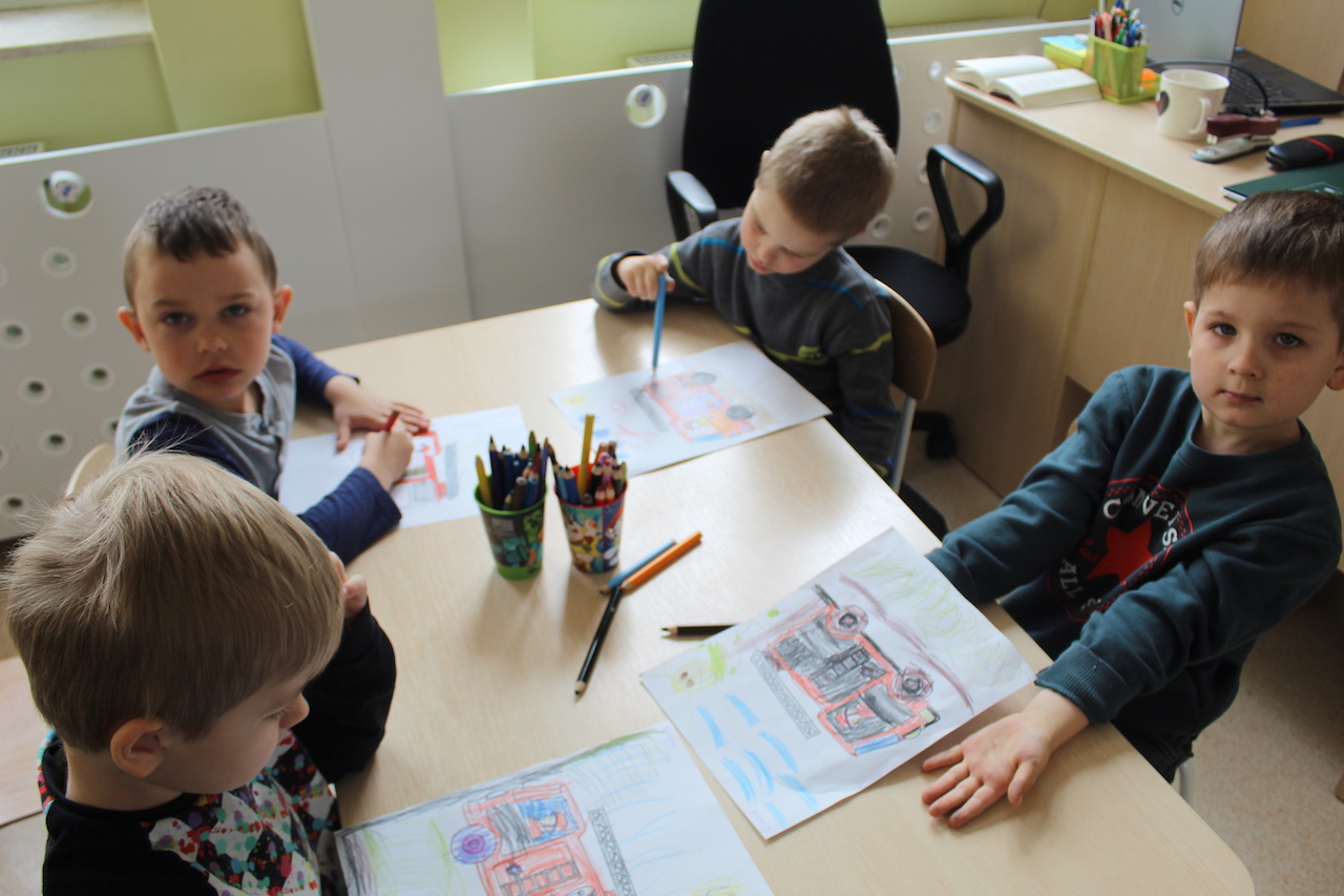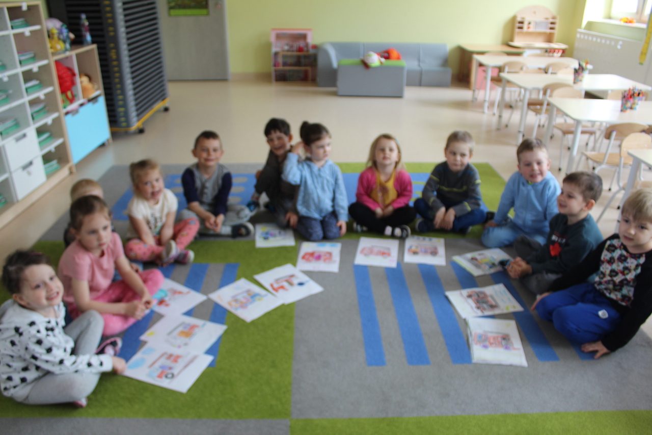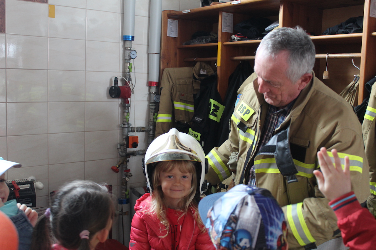 Kiedy przybyły na miejsce zostały przywitane przez strażaka pana Stanisława Papkę, który przybliżył dzieciom na czym polega praca w straży pożarnej. Przekazał cenne wskazówki jak bezpiecznie zachować się w czasie wypadku, czy pożaru. Dzieci miały możliwość z bliska obejrzeć wozy strażackie, specjalistyczne wyposażenie wozu, jak również mogły posiedzieć w jednym z nich. Dużo radości dzieciom sprawiło przymierzanie hełmów strażackich. Zainteresowanie było ogromne. Przy tej okazji dzieci utrwaliły numery alarmowe 998 i 112. Dowiedziały się w jakich okolicznościach należy wezwać straż pożarną. Spotkanie to z pewnością na długo pozostanie w pamięci dzieci. Na koniec zrobiliśmy sobie pamiątkowe, grupowe zdjęcie. Z wycieczki dzieci wróciły pełne niezapomnianych wrażeń.