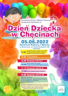 Serdecznie zapraszamy do wspólnego świętowania Dnia Dziecka, które odbędzie się 5 czerwca 2022 r. na placu przy hali „Pod Basztami”. W programie występy artystyczne, eksplozja kolorów i zabawy dla najmłodszych.